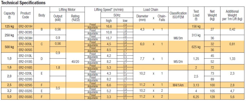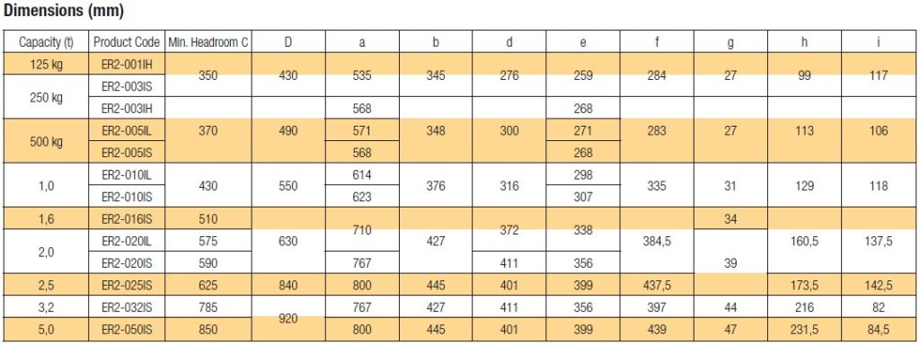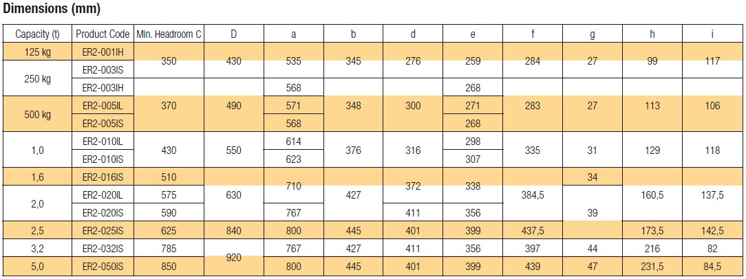 | Nosivost dizalice | 0,125, 0,25 IS, 0,25 IH, 0,5 IL, 0,5 IS, 1 IS, 1 IL, 1,5, 2 IL, 2 IS, 2,5, 3,2, 5 t |