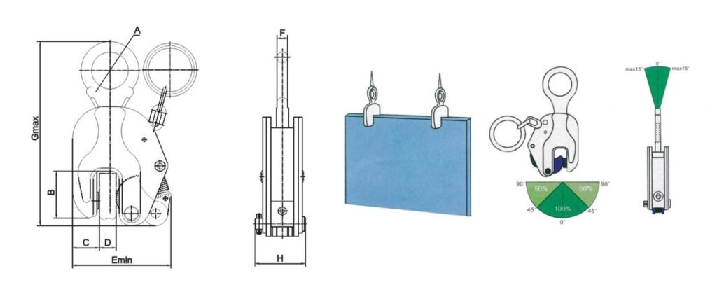 QC-B vertikalni hvatač limova sa krutim priključnim okcem služi za prihvatanje i dizanje limova, ploča, greda i ostalih čeličnih elemenata u uspravnom položaju uz upotrebu nosive grede – traverze. Mehanizam za zabravljivanje sa oprugom obezbeđuje početnu silu stezanja. Nazubljeni hvatač obezbeđuje neophodnu sili stezanja prilikom podizanja limova. Zubci se urezuju u površinu. Iz tog razloga se hvatač limova sme koristiti samo za podizanje tereta čija je površinska tvrdoća najviše 300HB (otprilike 32HRC). Težina tereta treba da bude minimum 10% nosivosti hvatača limova.
